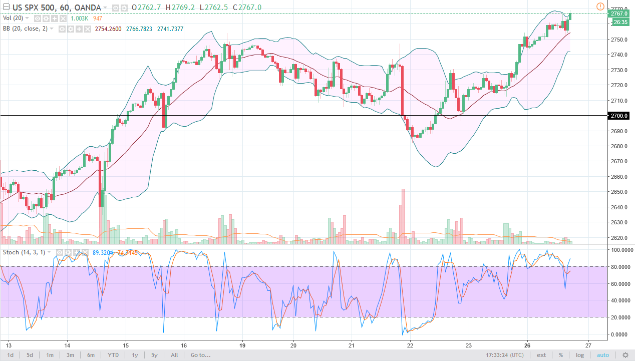 The S&P 500 has rally again on Monday, reaching above the 2765 level. I believe that there is support underneath, and the Bollinger Bands indicator has turned very positive, with the 20 SMA offering a significant amount of support. I think that the 2800 level will be targeted just above, which is an area that should offer a bit of psychological resistance. I believe the pullbacks should be buying opportunities, and that the 2750 level should be short-term support. Ultimately, if we break down below that level the market will go looking towards the 2725 level after that. I believe that the S&P 500 will continue to strengthen, because quite frankly we had formed a massive hammer on the weekly chart from the previous week, showing signs of value hunting yet again.