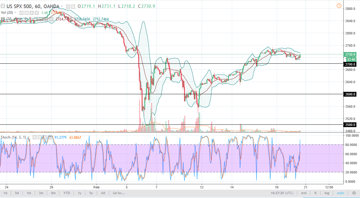 The S&P 500 has been very noisy during the trading session on Tuesday, as we continue to bounce around near the 2725 handle. Volatility should continue, but I think that we are starting to see value hunters return.