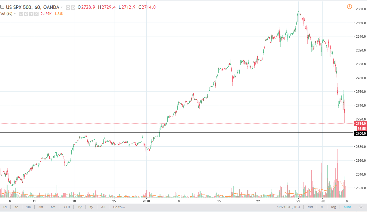 The S&P 500 has sold off rather drastically during the trading session on Monday, as we are starting to reach towards the 2700 level. The reason I have this chart so zoomed out is that the 2700 level should be an area of interest. We are getting a bit oversold, so I would expect some type of stability near this level, but I also can clearly see that if we break down below 2680, we go much further.
