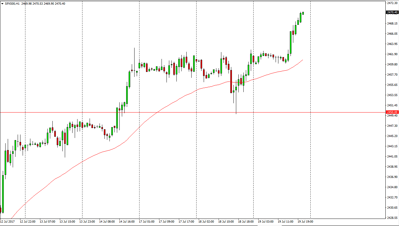 The S&P 500 went sideways initially during the day on Wednesday, then shot through the 2460 handle rather handily. It’s very likely that the market