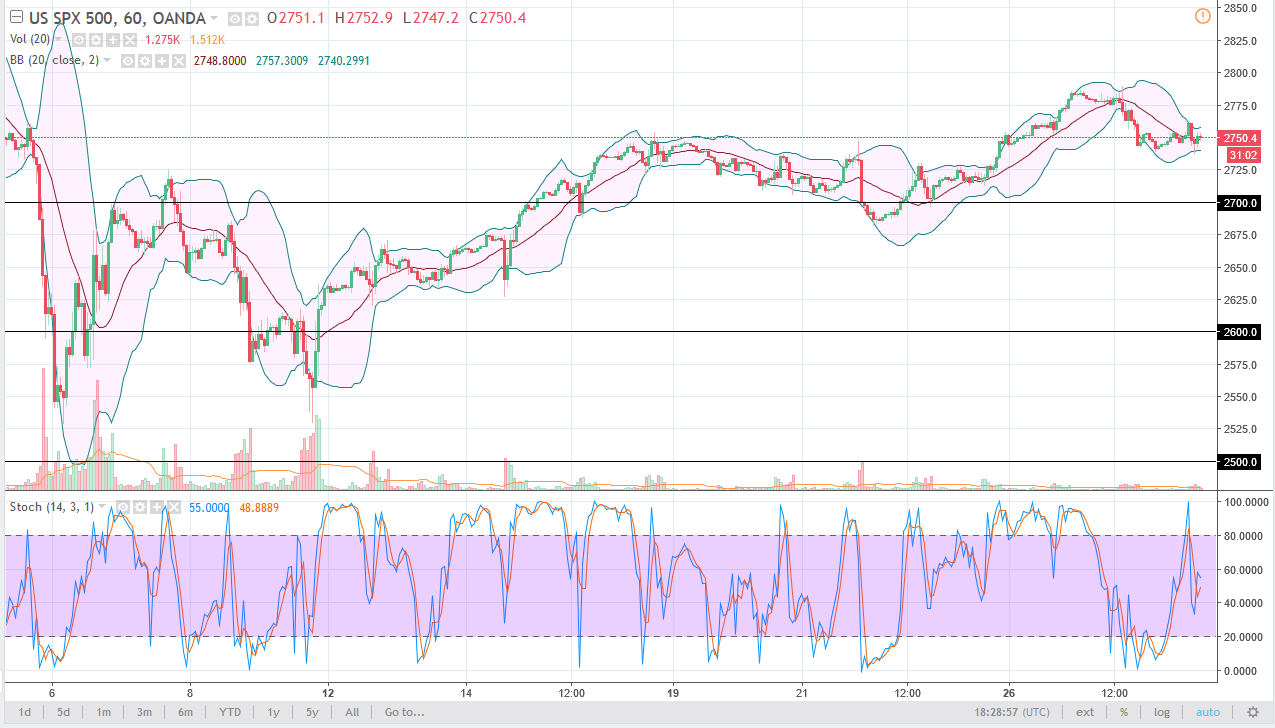 The S&P 500 has been choppy on Wednesday, as we hang about the 2750 level. I think that the market has plenty of support underneath, especially if the 2700 level which is acting as a floor.