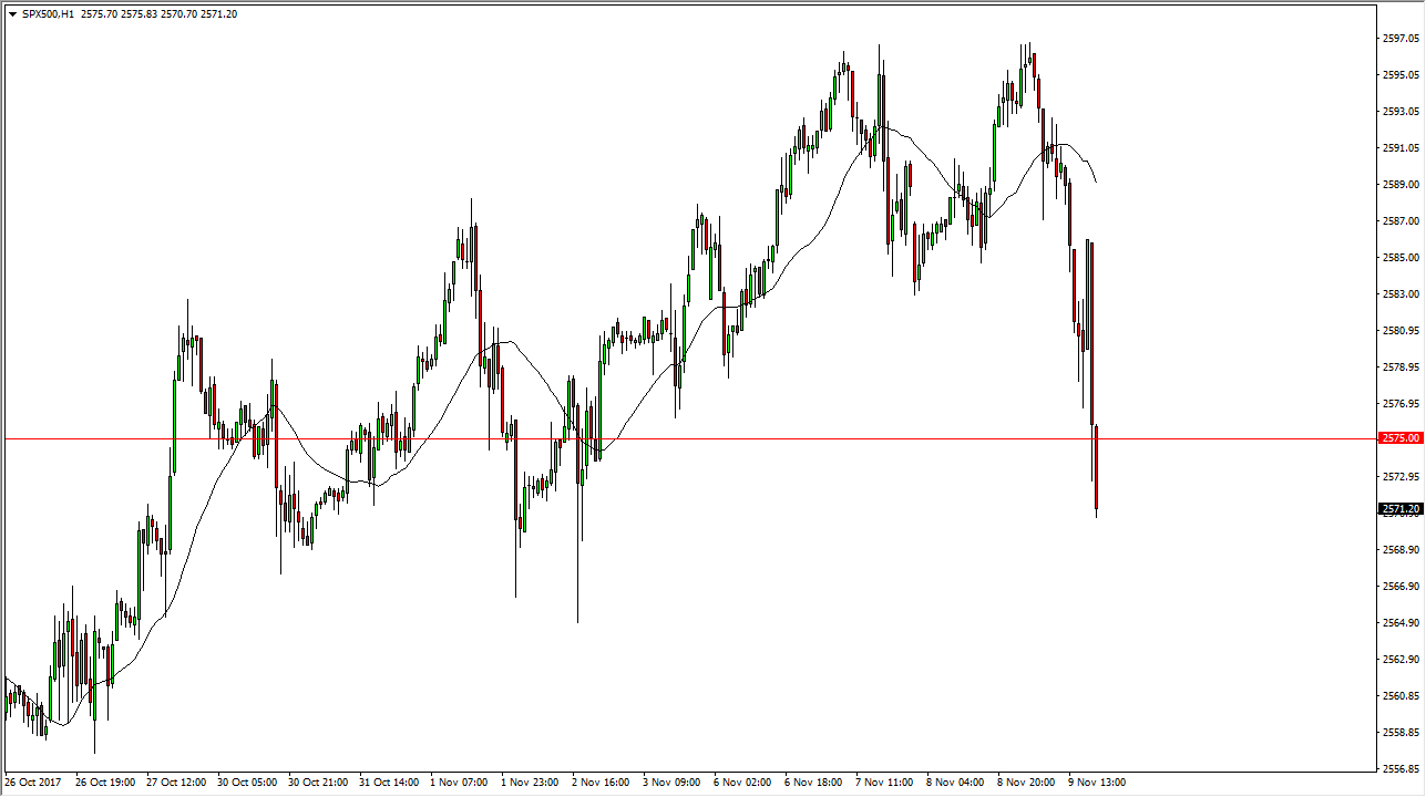 The S&P 500 fell hard during the trading session on Thursday, as word got out that the tax reform may be pushed back farther than anticipated, and as with all things tax reform related, the market seems to be hinging on it. I think that breaking through the 2575 handle was indeed important, and I also think that we will continue to go little bit lower. Quite frankly, this is welcome news as we have gotten far ahead of ourselves, and the market is overextended. When the markets get this hot, it tends to attract a lot of “scared money”, and I think that the traders that get involved in that area are jumping out as they are afraid of catching the top of the market, something that’s very possible considering how far we had gone. However, I think that it’s only a matter of time before the buyers return, based upon algorithmic trading. However, it is certainly a good time to stay away from the market, and cheer for lower levels, as it gives you value that is so desperately needed.