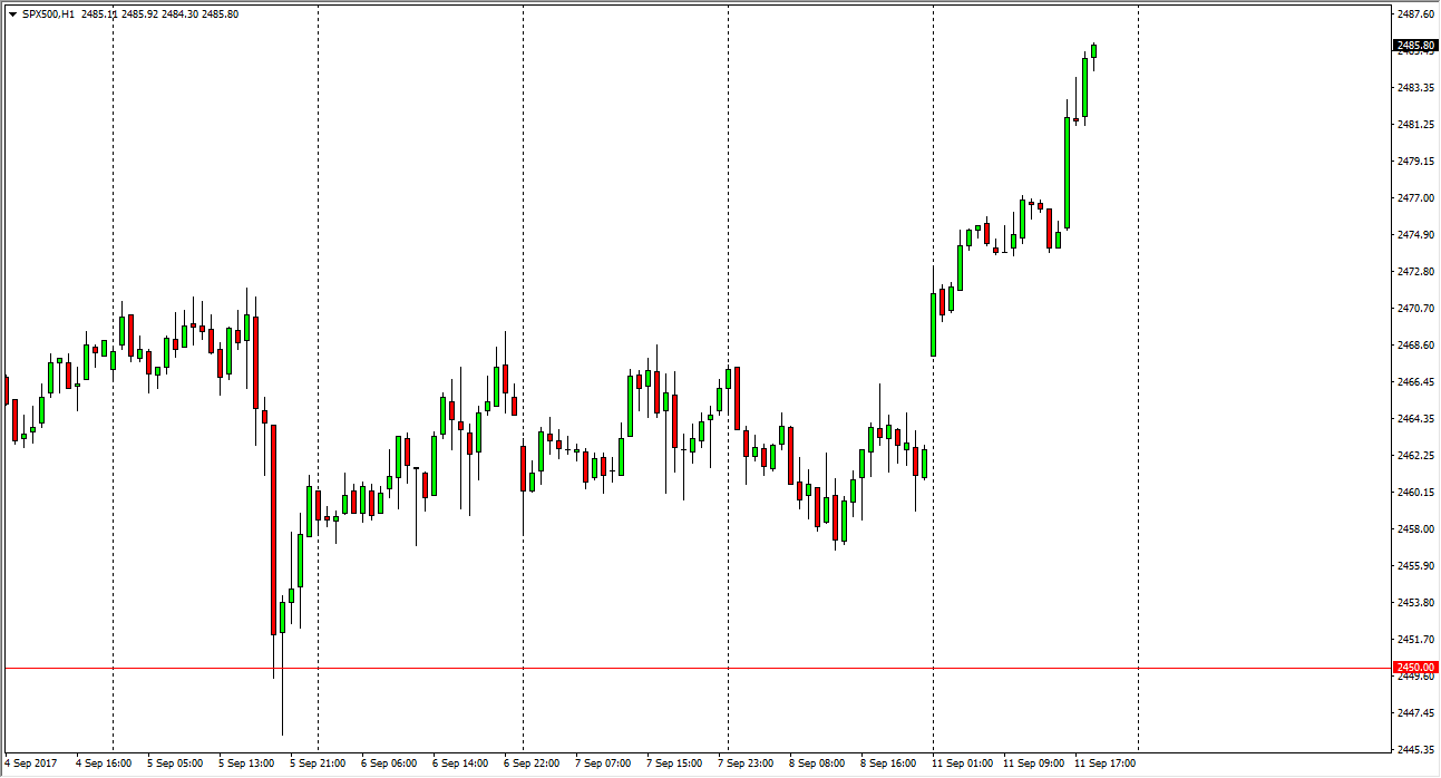 The S&P 500 gapped higher at the open on Monday, and never look back. We are now approaching the 2500 level, just 15 points away. That level will be resistive, but I think if we can break above there, the market becomes more of a “buy-and-hold” scenario. Buying dips should continue to be the way going forward, and even if we do pull back, the gap that formed at the beginning of the session should offer plenty of support if you are patient enough to wait for the buyers to come back. I have no interest in shorting the S&P 500.
