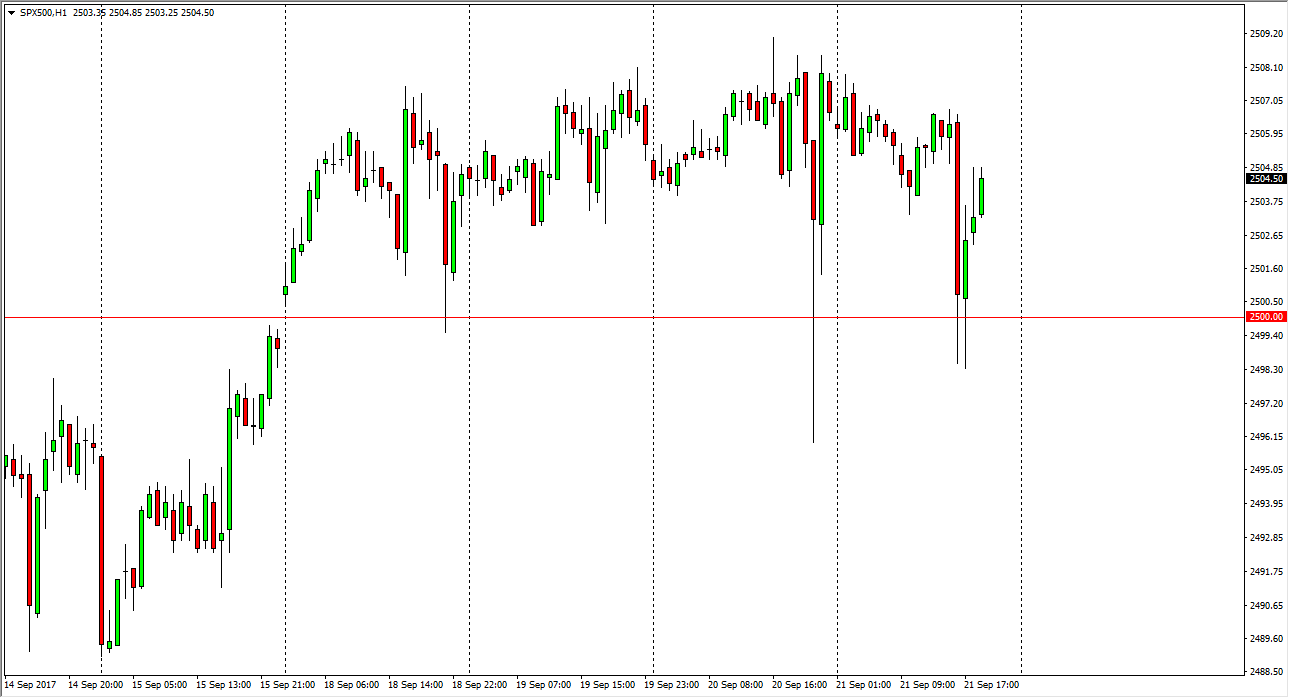 The S&P 500 fell a bit during the day initially on Monday, dropping down to the 2500 level. The 2500 level offered enough support to turn around and cause the market abounds, this is an area that has previously been resistive, and there is a gap in this general vicinity, that continues to hold the market higher. I think eventually will break out to the upside, as the market has come back around to the idea of the Federal Reserve shrinking its balance sheet, and that it may not be the end of the world. Ultimately, the market probably goes looking for the 2525 handle, which of course is resistive. On the other hand, if we were to break down below, that would be a very negative sign but I still think that there’s plenty of support below at the 2490 handle after that.