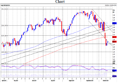 S&P December contract Daily Forecast - 15 October 2014Emini S&P held 1867/66 & beat immediate resistance at 1880/84 but topped at 1892/93, below our selling opportunity at 1901/05. No sign yet of a bottom to the 4 week bear trend. Outlook remains negative & failure to beat 1884/88 should trigger a move lower towards 1880/78 then 1866/65. A break lower today targets 1855/54. Any further losses target good support at 1840/35 which may just hold the downside temporarily at this stage. Exit shorts here & try longs down to trend line support at 1825 with stops below 1815.