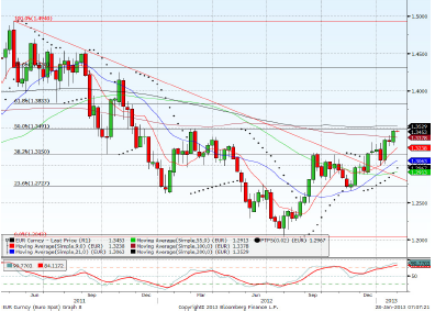 Spot Euro Forecast for 4th February 2013EURUSD burst through major long term resistance at 1.3479/91 and the 200 week moving average at 1.3529 last week, extending the 5 month uptrend and we have now hit our upper target of 1.3690 as hoped. We topped out just above at 1.3711 and a break above here this week then targets 1.3833/37. We could see the market cap here at this stage.