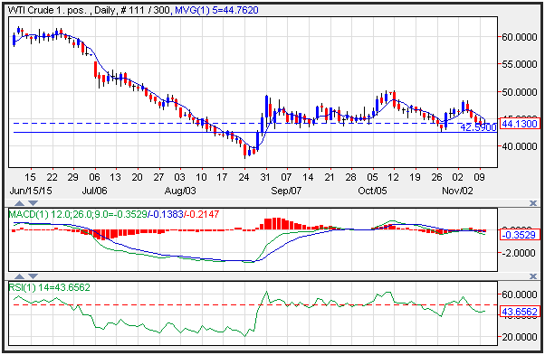 Crude hit a high of 44.32 highs overnight but was unable to gain traction and closed nearly unchanged at 44.13. The IEA said it expects prices to recover to the $80 per barrel region by the end of the decade, as dried up capital investment, which has put dozens of exploration projects on hold, will eventually impact production levels. This news did nothing to support prices, as the market remains over-supplied.