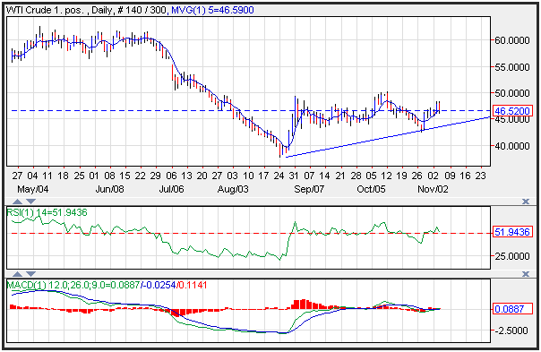 Prices snapped back down to the 5-day moving average at 46.59, after testing Tuesday’s highs at 48. 35. Support is an upward sloping trend line that comes in near 43.50. Momentum remains positive after the MACD generated a buy signal on Monday.