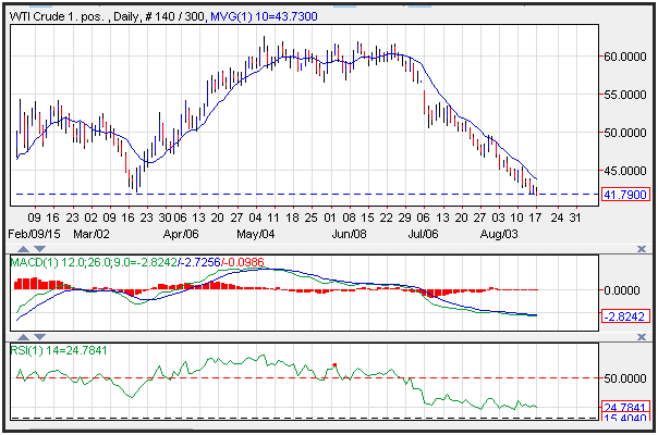 Crude oil prices moved lower on Monday, closing below $42 per barrel, and pushing through trend line support. Prices were under pressure following a