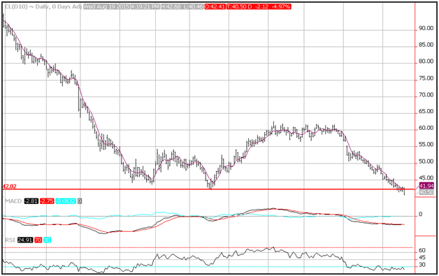 Crude oil prices sliced through the recent lows and are now poised to test the 2008 lows following a counter season build in crude oil inventories. Momentum is negative with the MACD printing in the red with a downward sloping trajectory. The RSI continues to printing in oversold territory at 24, below the oversold trigger level of 30. Resistance is seen near the 5-day moving average at $41.94.
