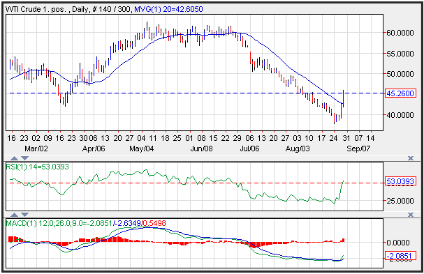 Crude oil broke out on Thursday and continue to rally on Friday. Prices closed above a downward sloping trend line that coincides with the 20-day moving average. The next level of target resistance is seen near $49. Support is seen near the recent lows at $38.22. Momentum has turned positive with the MACD (moving average convergence divergence) generating a buy signal.