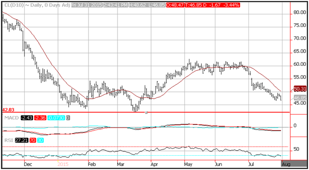 Crude closed at a 4-month low and is poised to test support levels near the March lows at $42.03. Momentum remains negative with the MACD (moving average convergence divergence) index printing in the red with a downward sloping trajectory. The RSI continues to print a reading of 27, below the oversold trigger level at 30, which could foreshadow a correction.