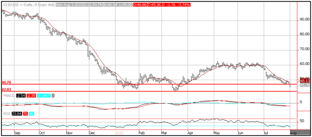 Crude oil prices tumbled through horizontal trend line support and is poised to test the lows from March at $42.03. Prices were pulled down by the softer than expected Chinese PMI report. The China CAIXIN Manufacturing PMI fell to 47.8 in July, down from 49.4 in the previous month. The drop to a 2-year low suggests that contraction in China’s manufacturing sector accelerated at the start of the third quarter.