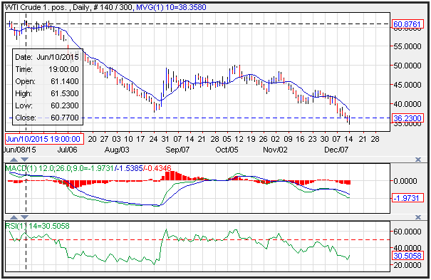 Crude oil prices opened lower on the trading session pushed down by warmer than expected weather for the next 2-weeks. Heating oil prices continued to move lower placing downward pressure on crude oil. Later in the trading session, prices rebounded from a 7-year low at 34.53, and moved up on the day closing near 36.20. Resistance on oil prices is seen near the 10-day moving average at 38.35, while support is seen near Monday’s low.