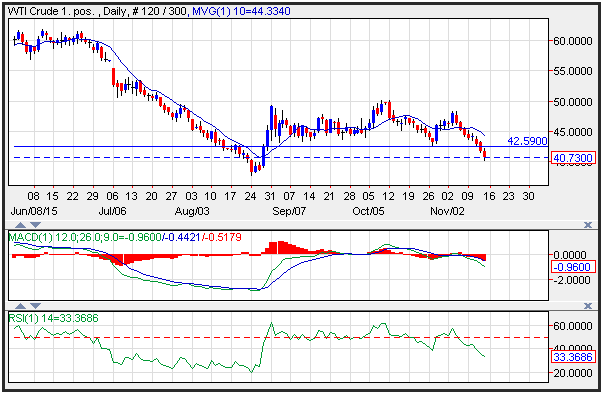 The unbalanced supply/demand equations is expected to remain in surplus through 2016. The market now eyes the key 37.75 August lows. Resistance is seen near the breakdown level which was the October lows near 42.59. Additional resistance on crude oil prices is seen near the 10-day moving average at 44.33. Momentum remains negative with the MACD (moving average convergence divergence) index, which is a momentum indicator, printing in the red with a downward sloping trajectory which points to lower prices for crude oil.