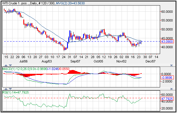 Crude oil prices rallied to 42.25 from 41.90 following the EIA inventory data which showed a 961k barrel rise in crude stocks. The street had been expecting a 1.0 million barrel increase. Additional upside was generated when Baker Hughes announced that drilling rigs dropped by 9 rigs in the latest week. Resistance on crude prices are seen near the 20-day moving average at 43.56, while support is seen near 40. Momentum has turned positive with the MACD (moving average convergence divergence) index generating a buy signal. This occurs as the spread (the 12-day moving average minus the 26-day moving average) crosses above the 9-day moving average of the spread.