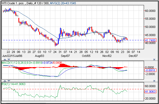 Crude oil prices moved lower on Friday after failing to breach resistance near the 20-day moving average at 43.15. Friday’s downdraft in Chinese stocks