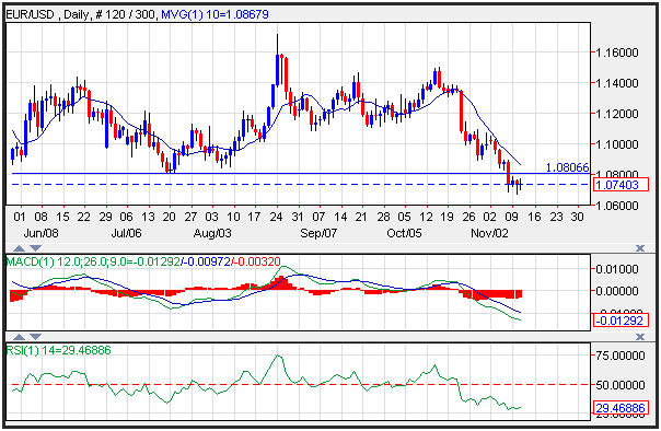 The bond market was closed in the U.S. on Wednesday giving traders little incentive to trade the greenback. With yields on hold until Thursday’s return, the EUR/USD received a respite from its two week decline. The currency pair remains below resistance which was former support at 1.0806, while the exchange rate was unable to generate a new lower low. The RSI remains in oversold territory printing a reading of 29, which is below the oversold trigger level of 30.