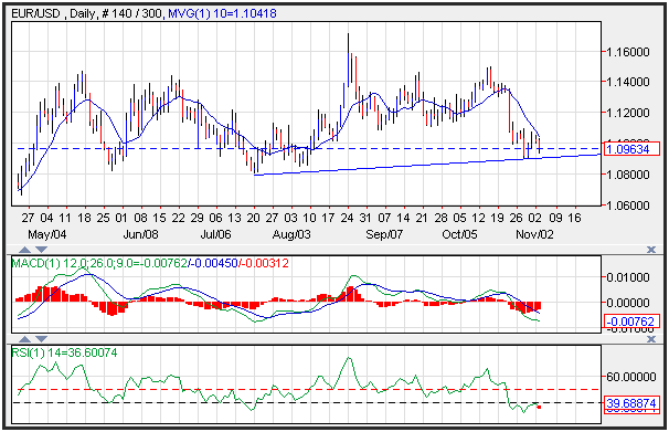 The currency pair moved toward support near an upward sloping trend line that connects the lows in June to the lows in October and comes in near 1.0915. Resistance is seen near the 10-day moving average at 1.1041. Momentum remains negative with the MACD printing in the red and the RSI moving lower with price action dipping below for into the lower end of the neutral range.