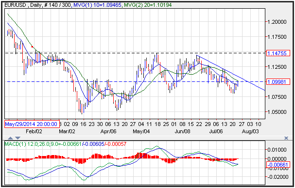 Support is now seen near the 10-day moving average at 1.0946, and then again the weekly lows at 1.0865. Additional resistance is seen near a downward sloping trend line that connects the highs in June to the highs in July at 1.0895. Momentum on the currency pair has turned positive with the MACD (moving average convergence divergence) index generating a buy signal. This occurs as the spread (the 12-day moving average minus the 26-day moving average) crosses above the 9-day moving average of the spread. The index moved from negative to positive territory confirming the buy signal.