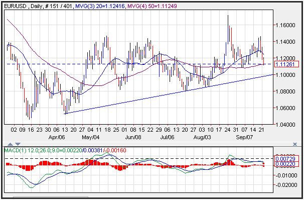 The EUR/USD moved lower on Tuesday pushing through support near the 50-day moving average at 1.1124. U.S. yields continued to outperform European yields