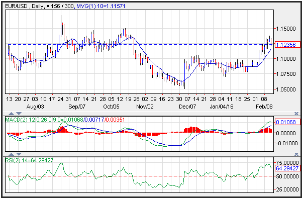 The EUR/USD moved lower on Friday giving back some of its recent gains as riskier assets increased in value, driving bonds lower which benefited the dollar. Q4 German GDP did little to help the Euro gain traction. Support is seen near the 10-day moving average near 1.1157. Resistance is seen near the October highs at 1.1495. Momentum remains positive with the MACD printing in the black, but the trajectory is flattening reflecting consolidation.
