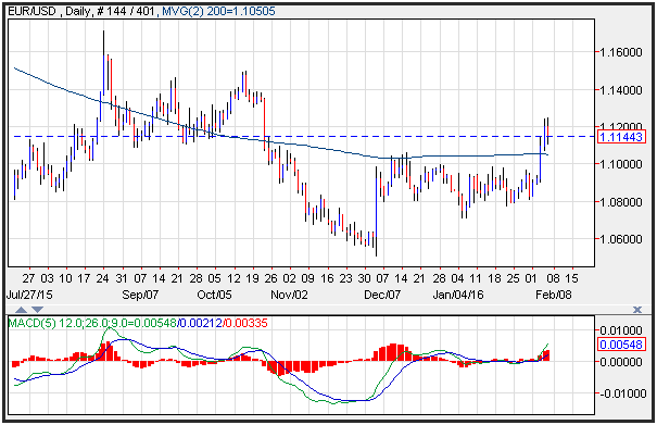 The EUR/USD lost ground on Friday following a mixed U.S. payrolls report that showed stronger than expected wage growth, and a declining unemployment rate. This came despite a lower overall headline number than came in worse than expected. The currency pair dropped and is poised to test support near the 200-day moving average at 1.1050. Resistance is seen near the recent highs at 1.150. Momentum remain positive with the MACD printing in the black.