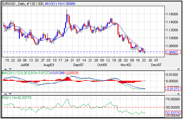 The EUR/USD was nearly unchanged but experienced headwinds following a softer than expected consumer confidence report released during the U.S. session. The stronger than expected German IFO survey gave the currency pair a boost, but it was unable to hold its ground. Resistance on the exchange rate is seen near the 10-day moving average at 1.0699, while support is seen near Monday’s lows at 1.0630. Momentum is non-existent as the MACD printing near the zero index level with a flat trajectory. The RSI is also flat while printing a reading of 32, which is just above the oversold trigger level of 30, while generally implies and impending correction.