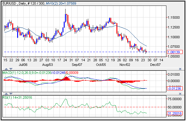 The EUR/USD traded in less than a 30 pip range into the North American Trading session. The low has been 1.0600, which now has the feel of being a firm near-term support. Volumes and impetus lacking with both U.S. markets and date out of the picture, due to the Thanks Giving Holiday. The market may be dull today, but the market still appears to be euro bearish in anticipation for a policy easing from the ECB next week.