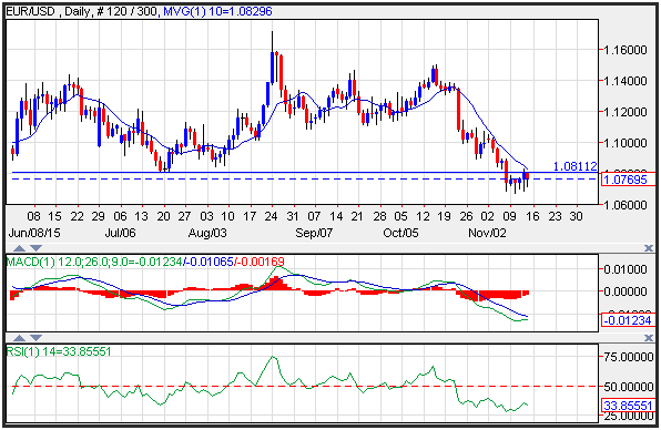 The EUR/USD ran into resistance following the softer than expected EU GDP report. The exchange rate on the currency pair was unable to push above the July lows at 1.0812 and retreated back to the 1.0770 level. Additional resistance is seen near the 10-day moving average at 1.0830. Support is seen enar the November lows at 1.0680. Momentum remains negative as the MACD is printing in the red but the trajectory is flattening reflecting consolidation.