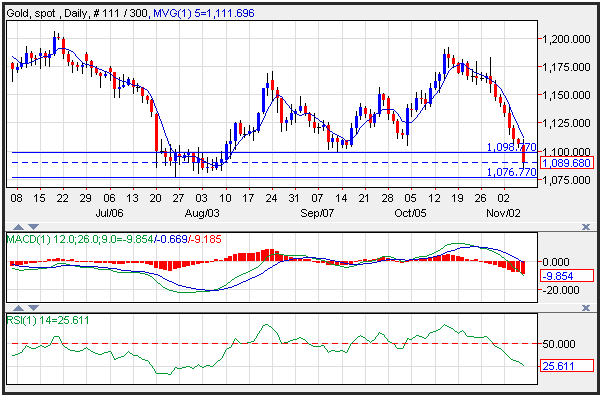 Gold prices tumbled on Friday as the dollar gained strength in the wake of the better than expected U.S payroll report. Yields soared across the curve, driving the dollar up nearly 1.25% against a basket of currencies. Gold dropped through horizontal trend line support at 1,098 which is now seen as resistance. Prices will now likely test the July low at 1,076.