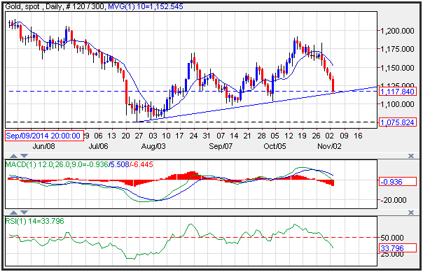 Gold prices dropped to trend line support which is created from an upward sloping trend line that connects the lows in June to the lows in October and comes in near 1,116. Momentum is negative with the MACD printing in the red with a downward sloping trajectory. The RSI (relative strength index) moved lower with price action reflecting accelerating negative momentum.