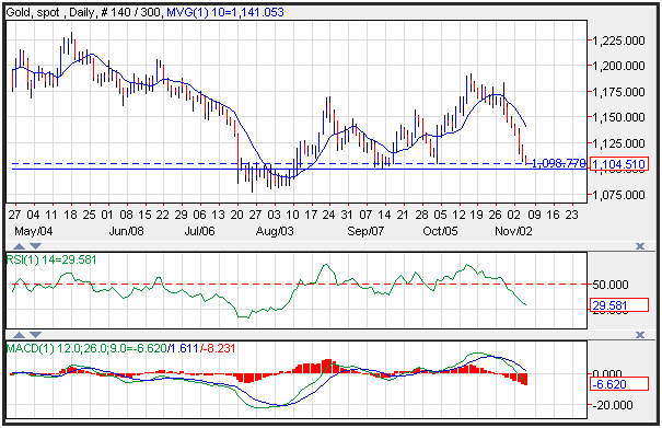 Gold prices edged lower on Thursday ahead of Friday’s U.S. employment report. This came despite a downtick in the greenback following a move higher in U.S. jobless claims. Support on the yellow metal are seen near the September lows a 1,098. Resistance is seen near the 10-day moving average at 1,141. Momentum remains negative with the MACD printing in the red with a downward sloping trajectory.