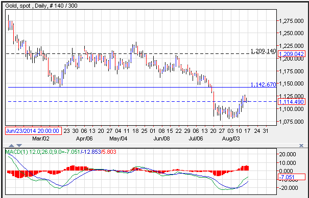 Gold prices edged lower and faces resistance near the recent highs at $1,126. Support is seen near the 10-day moving average at $1,000. Momentum is positive with the MACD printing in the black with an upward sloping trajectory.