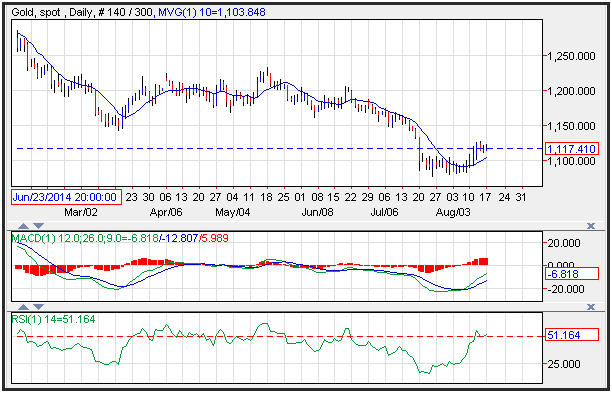 Prices are poised to test resistance near former support at $1,150, while short term support is seen near the 10-day moving average at $1,103. Momentum is positive with the MACD (moving average convergence divergence) index recently generating a buy signal and printing in the black with an upward sloping trajectory. The RSI is also moving higher with price action reflecting accelerating positive momentum while printing a reading of 51, which is in the middle of the neutral range.