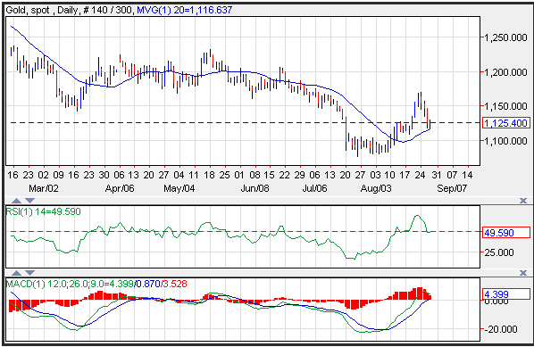 Gold prices moved higher bouncing off of the 20-day moving average at $1,116, despite the dollar gaining ground against most major currencies. Gold