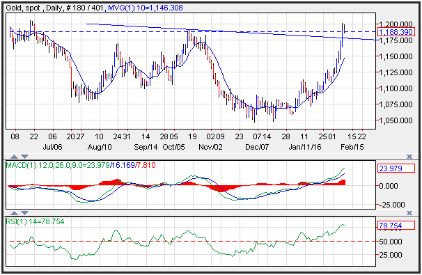Gold prices edged lower pulling back slightly on Tuesday after 5-consecutive higher highs. Support on the yellow metal is seen near former resistance at 1,178, while short term resistance is seen near the June 2015 highs at 1,204. Momentum on the gold prices is positive as the MACD (moving average convergence divergence) index prints in the black with an upward sloping trajectory that points to higher future prices for the yellow metal.