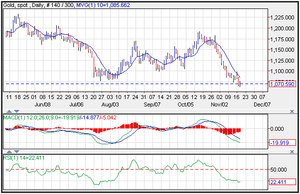 The next level of target support on gold prices is seen near the January 2010 lows at 1044. Resistance is seen near the 10-day moving average at 1085. Momentum on the yellow metal remains negative with the MACD (moving average convergence divergence) index prints in negative territory with a downward sloping trajectory. The RSI (relative strength index) continues to print near 22, below the oversold trigger level of 30, which could foreshadow a correction.
