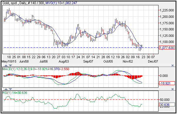 The yellow metal reversed leaving resistance near the 10-day moving average at 1,082. Support is seen near the November lows at 1,063. Momentum is negative but the trajectory of the MACD is changing and is poised to generate a buy signal. This occurs as the spread (the 12-day moving average minus the 26-day moving average) crosses above the 9-day moving average of the spread. The RSI moved higher with price action reflecting accelerating positive momentum, while printing a reading of 30.63, which is just above the oversold trigger level fo 30.