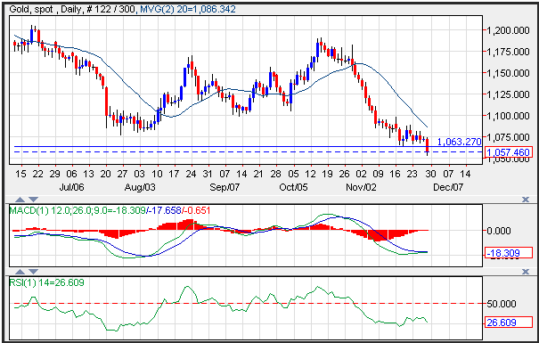 Resistance on gold prices is now seen near former support at 1, 063. The next level of target support is 1,048 and then 1,005. Momentum is negative but the recent consolidation has kept the MACD flat. This breakdown in prices should generate additional negative momentum in the days to follow. The RSI (relative strength index) moved lower with price action reflecting accelerating negative momentum while printing a reading of 26, which is below the oversold trigger level of 30 and could foreshadow a correction.