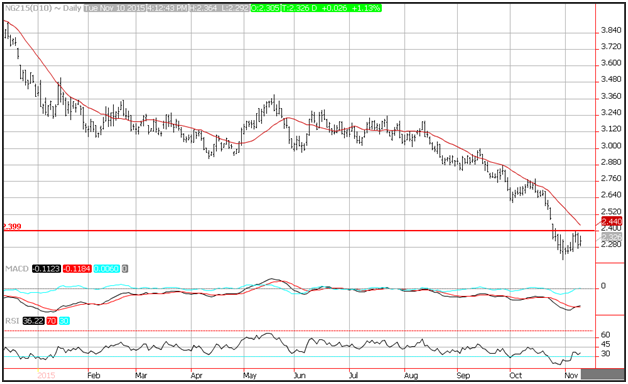 Support on natural gas is seen near the October lows at 2.19, while resistance is seen at 2.40 and then the 20-day moving average at 2.44. Momentum has turned positive with the MACD (moving average convergence divergence) index generating a buy signal. This occurs as the spread (the 12-day moving average minus the 26-day moving average) crosses above the 9-day moving average of the spread.