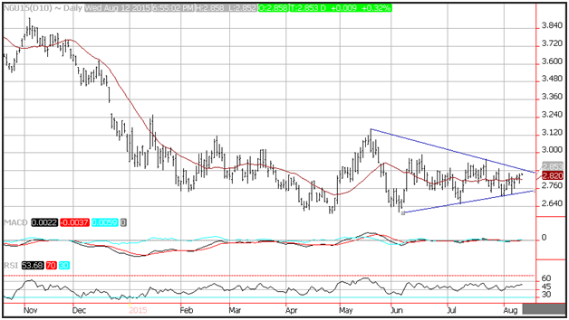 Prices are range bound with support at the 20-day moving average near 2.82. The range is capped at a downward sloping trend line coming in near 2.85, and an upward sloping trend line that targets support at 2.74. Momentum as reflected by the MACD and RSI is flat.