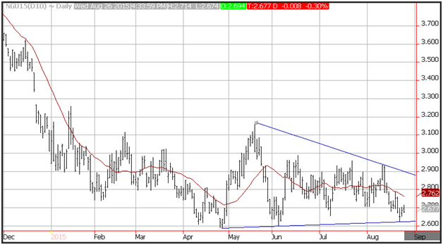 Natural gas prices were unable to gain traction despite news that Tropical Storm Erika is set to hit the Caribbean and head toward the Gulf of Mexico. A hurricane can be a major disruption to natural gas production, and will generally cause a spike in prices during the August – October period. Warmer than normal weather which is also forecast through most of the United States according to NOAA, failed to lift prices.