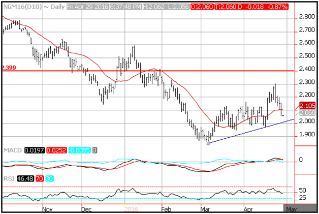 Natural gas prices initially slipped following a report from the Department of Energy that showed a larger than expected build in inventories. Prices slid below the 10-day moving average at 2.10 and are poised to test an upward sloping trend line at 2.02.