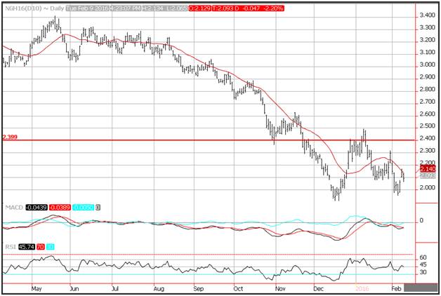 Natural gas prices moved lower on Tuesday after traders were unable to generate enough momentum to push the March contract above the 20-day moving average