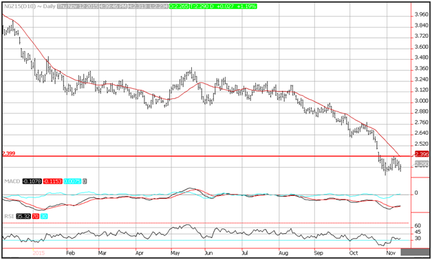 Prices made a fresh low on Thursday and also had a lower high but closed up on the day.  Resistance is now seen near the 20-day moving average at 2.40.  Support is seen near the recent lows at 2.19.  Momentum is positive as the MACD (moving average convergence divergence) index is printing in the black but the trajectory of the MACD is relatively flat which reflects consolation.