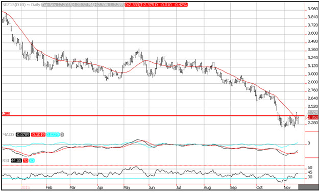 Prices dipped on Monday but rebounded on Tuesday above the 20-day moving average at 2.35. Resistance is seen near a horizontal trend line at 2.40. Support on the currency pair is seen near 2.28, and then the October lows at 2.20. Momentum is positive with the MACD (moving average convergence divergence) index printing in positive territory with an upward sloping trajectory. The RSI moved higher with price action reflecting accelerating positive momentum, while printing a reading of 44, which is in the middle of the neutral range.