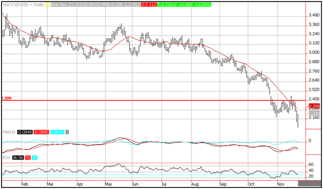 Natural gas prices rebounded after setting new lows on Monday hitting 2.05. Resistance is seen near the 10-day moving average at 2.30. Moderate weather and robust production have pushed the market into oversupply in recent months. Stockpiles of natural gas rose to 4 trillion cubic feet for the first time on record in the week ended Nov. 13, according to the Energy Information Administration.