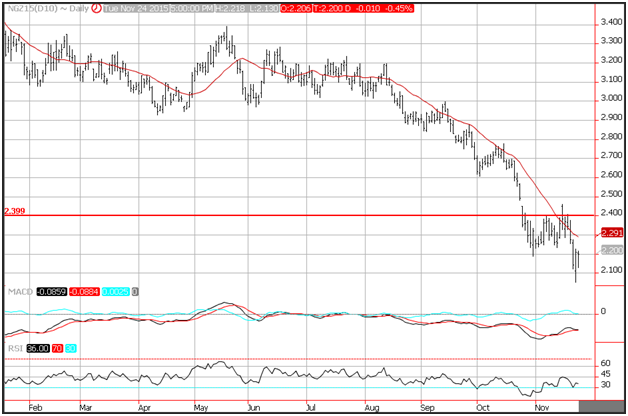 Natural gas was unable to test support level near the November lows at 2.07. Resistance is seen near the 20-day moving average at 2.29. Momentum has turned negative with the MACD (moving average convergence divergence) index generating a sell signal. This occurs as the spread (the 12-day moving average minus the 26-day moving average) crosses below the 9-day moving average of the spread. The index moved from positive to negative territory confirming the sell signal. The RSI (relative strength index) edged lower on Tuesday and is printing a reading of 36, which is on the lower end of the neutral range.