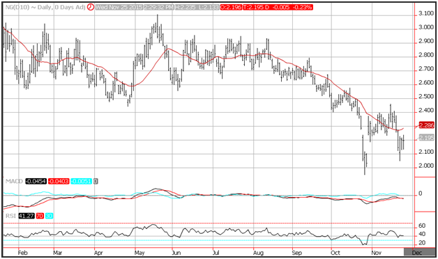 Natural gas prices edged lower on Wednesday but settled well off their lows following a larger than expected build in natural gas inventories. Resistance on natural gas is seen near the 20-day moving average at 2.28, while support is seen near the November low at 2.05. Momentum remains negative with the MACD (moving average convergence divergence) index printing in the red, but the trajectory is relatively flat, pointing to consolidation. The relative strength index (RSI) is printing a reading of 41, which is in the middle of the neutral range and also reflects consolidation.